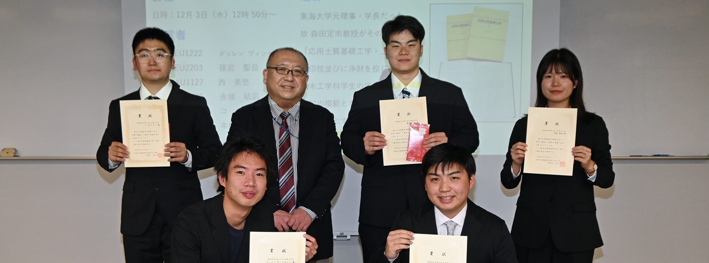 建築都市学部土木工学科では12月3日に、湘南キャンパスで「2025年度 森田学業奨励賞」の授賞式を開催しました。この賞は、東海大学の元理事・学長で本学科の主任教授なども務めた故森田定市教授が、学生の学業奨励のために著書『応用土質基礎工学』上下巻の印税と浄財を投じて制定したものです。毎年1回、成績を考慮して学科の模範となるべき学生を各学年2名ずつ表彰しています。