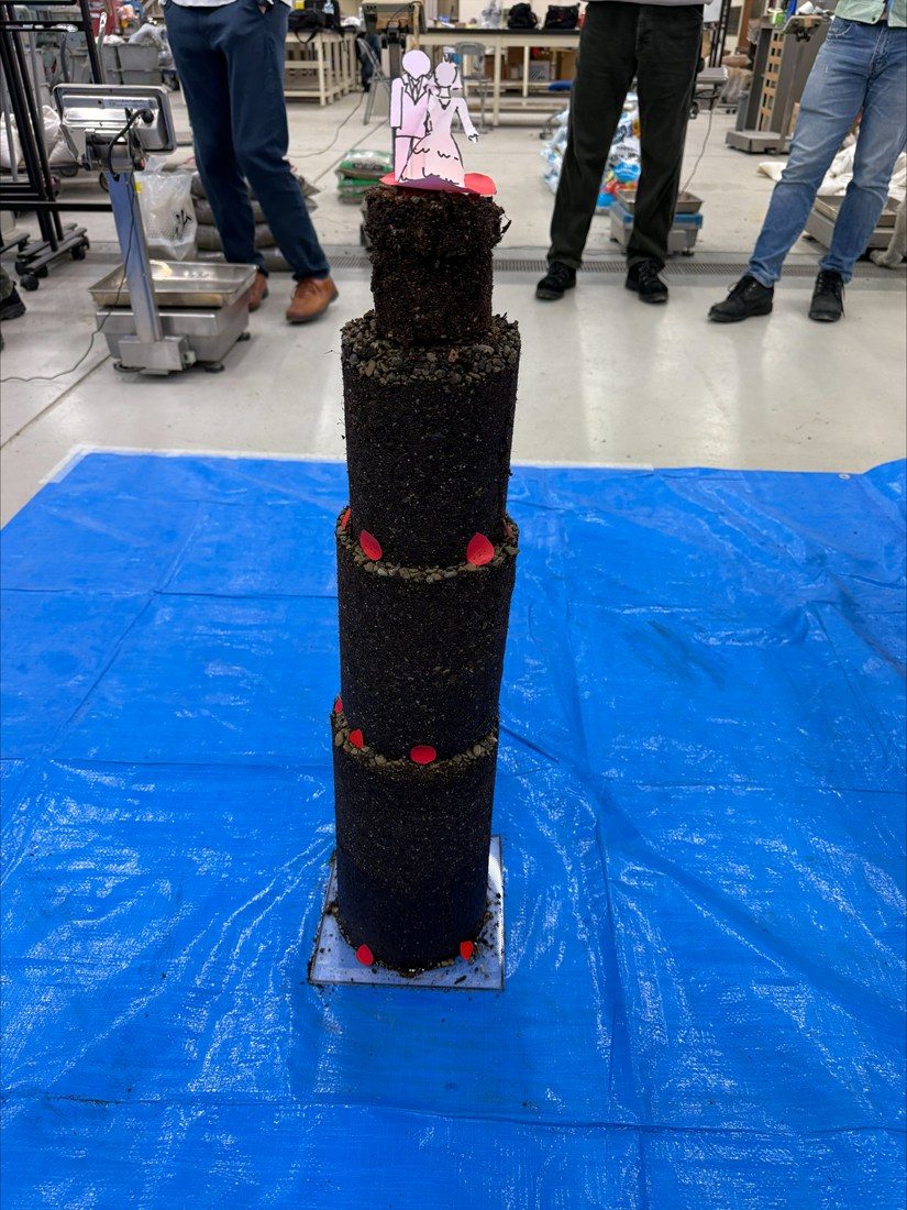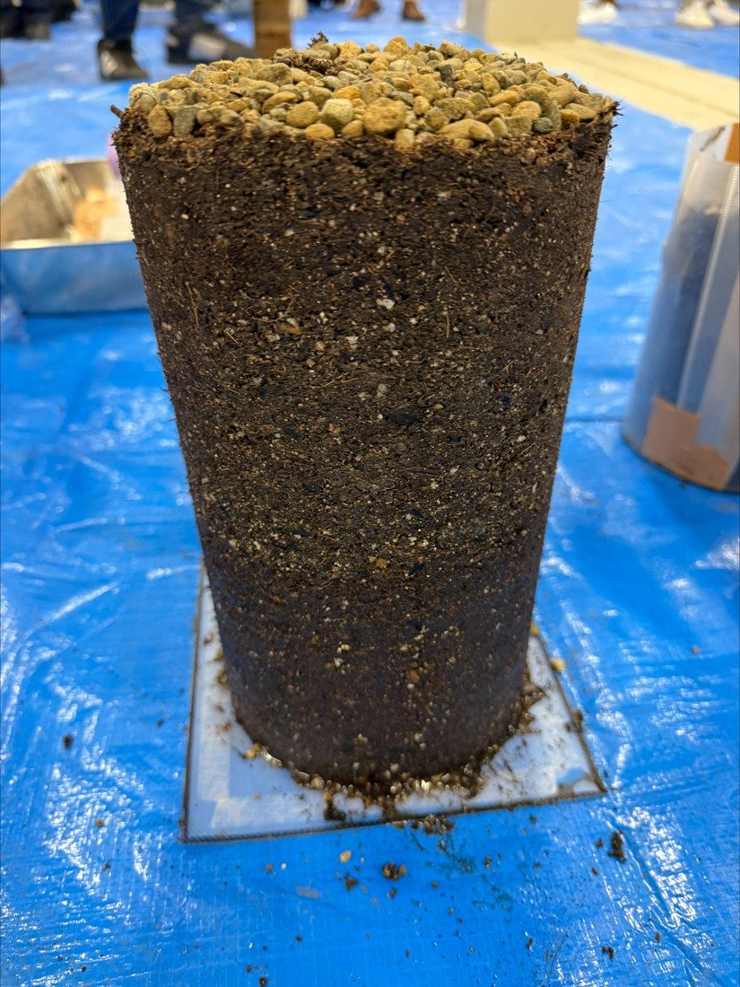「第18回ソイルストラクチャーコンテスト」のテーマは「仲間とチャレンジ! 高さとデザインの調和を目指せ! ソイルタワー」で、指定材料2種類(まさ土、砂利)と自由材料3種類(赤玉土、砂、野菜土)から2種類を選択し、合計4種類の地盤材料を混合し、3時間ほどの制限時間内にソイルタワーの完成を目指すものです。タワーを作成するための道具や装飾なども指定された税込み440円以内の予算内で用意する必要があり、事前準備に加えてチームワークも重要な要素となります。当日は、学生や社会人で構成された7組が出場。3名は出場チームの多くが5名構成の中で奮闘し、地盤材料を締め固める型枠に安価なクリアファイルを使うなどアイデアを出し合いました。「高さ」「デザイン」「プレゼン」の3項目の審査の結果、土木関連企業などの社会人チームを抑えて見事に総合優勝に選ばれました。