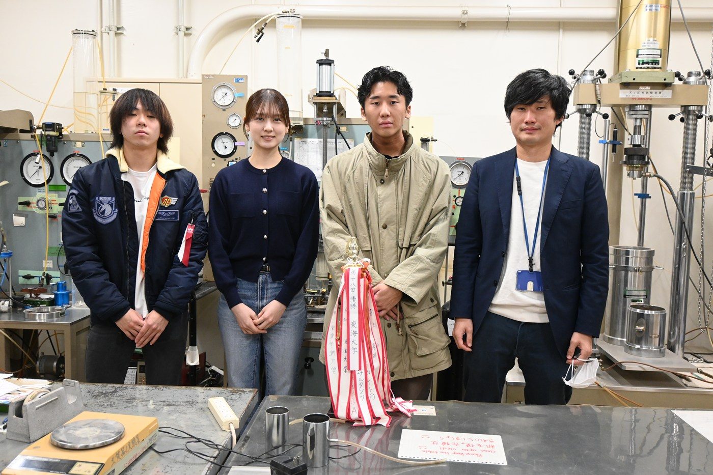 建築都市学部土木工学科の藤原覚太講師の研究室に所属する森友吾さんと舘山遥人さん、浅田麻衣さん(いずれも4年次生)の3名が、昨年10月25日に日本大学理工学部船橋キャンパスで開催された「第18回ソイルストラクチャーコンテスト」(主催:地盤工学会関東支部)で総合優勝しました。同学会関東支部20周年を記念した「ショート動画コンテスト」でも支部長賞を受賞しました。