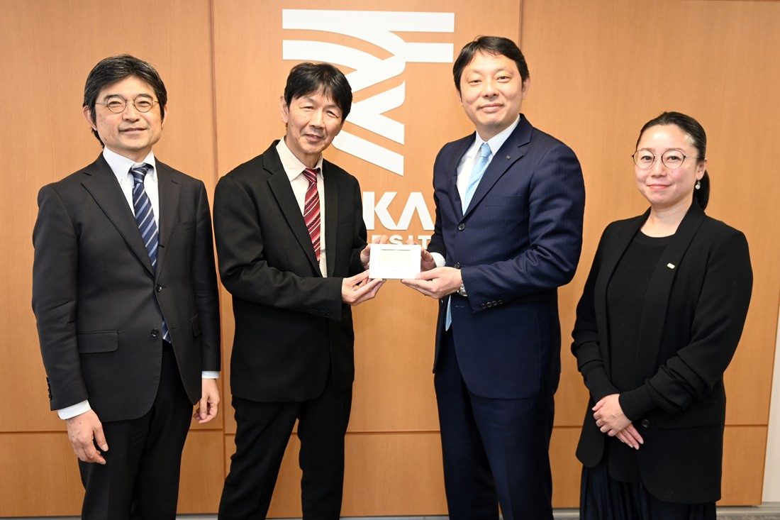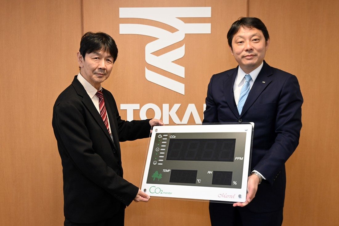 建築都市学部建築学科にこのほど、シー・エイチ・シー・システム株式会社からCO₂モニターが寄贈され、1月27日に湘南キャンパスで寄贈式を実施しました。同社は建築設備の設計や施工を担いつつ、環境機器の開発や設計、製造も手掛けており、本学科の山川智教授とも共同研究を行ってきたことから、卓上置き型タイプの「マーベル001」を50台、大型ディスプレイタイプの「マーベル301」を1台寄贈。同社代表取締役社長の渋谷俊彦氏と経営企画部人財開発課課長代理の松田千穂氏が湘南キャンパスを訪れ、高橋達学科長に手渡されました。