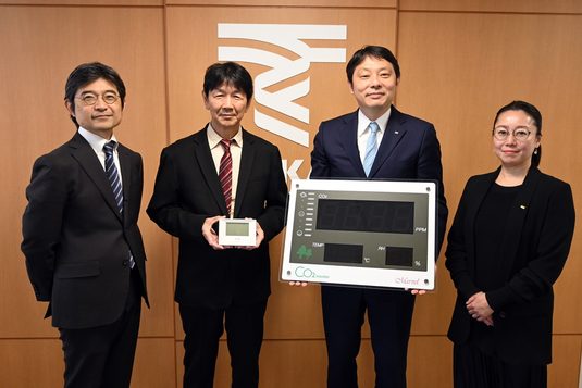 CO₂モニターは二酸化炭素だけでなく温度や湿度、オゾン、ニオイなどを見える化し、スマートフォンやパソコンで室内環境データを遠隔監視できます。小型のマーベル001は「建築環境工学演習」の授業で使用し、大型のマーベル301は19号館4階に設置する予定です。山川教授は、「暑さや寒さは体感できますが、湿度やCO₂濃度は感覚では分かりません。シー・エイチ・シー・システムのCO₂モニターは国内で最も精度が高いので、学生に小型モニターを1台ずつ貸し出して、さまざまな場所の室内環境を測ってもらおうと考えています」と話します。高橋学科長は、「室内環境を意識し、数値を測ることで、社会に出てから役立つ物差しを得られます。学生たちにはぜひモニターを使って生きた教材を活用してほしい」と期待を寄せました。渋谷氏は、「弊社の製品は室内環境をリアルタイムに測り、空気の質を効率よく改善するために必要な装置です。建物を設計するうえでも大切になる室内環境について学生たちが考える機会になればうれしい」と話していました。