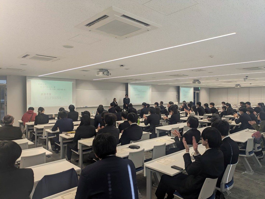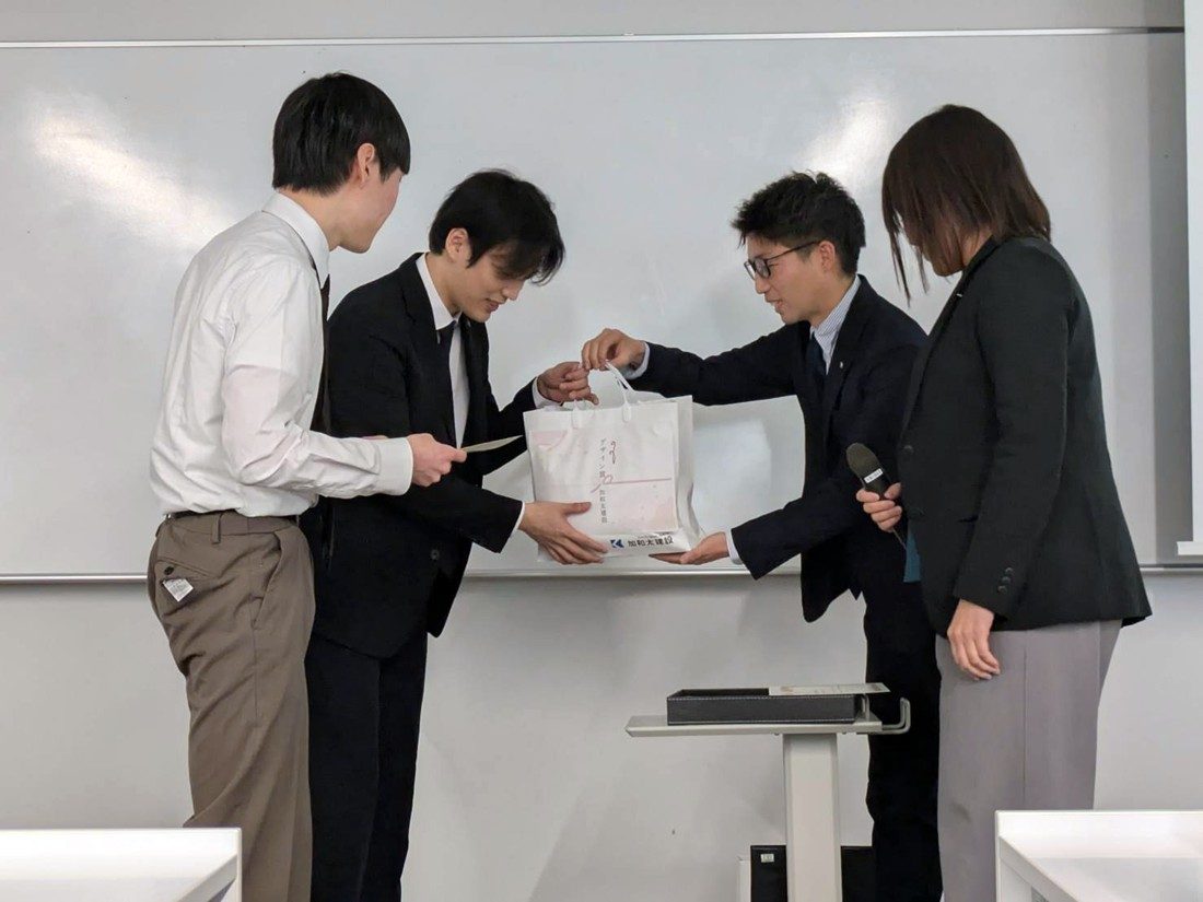表彰式では初めに、建築学科の渡部憲教授が学部長代理であいさつに立ち、「受賞した学生は今後の人生の糧に、できなかった学生は何が足らなかったのかを考えて次に生かしてください。最後まで取り組んだことをぜひ誇りに思ってほしい」と語りかけ、全員に修了証を手渡しました。続いて5つの企業から最優秀賞と優秀賞などが発表され、賞状と記念品が贈られました。参加した学生たちは、「サミットを通して学んだことを今後の研究や人生に生かしていきたい」「企業の方々に自分たちにはない現場の目線でサポートしていただき、勉強になりました」といった感想を口々に話していました。今年度は初めて他学部生も参加し、健康学部健康マネジメント学科の学生は、「アイデアを出していく中で、普段触れることのない視点を見つけることができました」と語り、ペアを組んだ建築学科生は、「社会に出てからも他の職種の方と関わる機会があると思うので、いい経験になりました」と話していました。