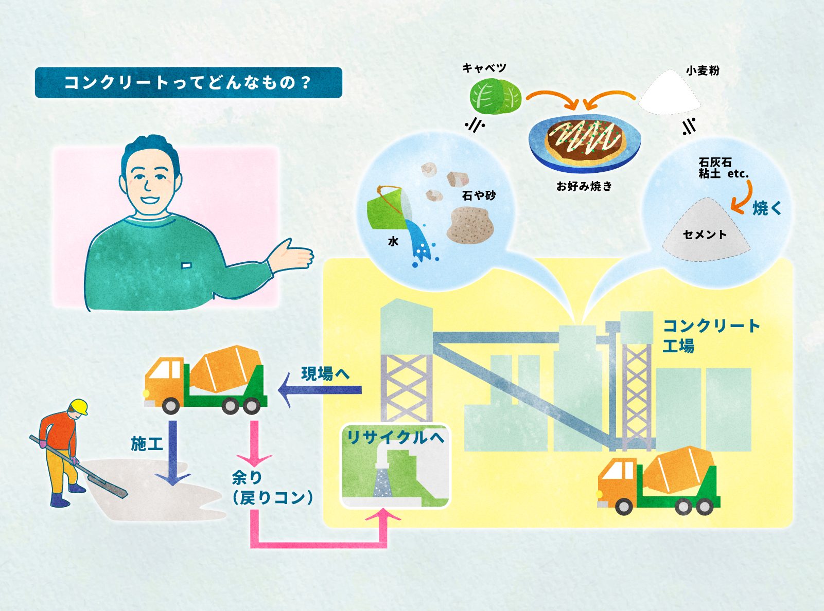 コンクリートはビルや橋、トンネル、ダム、海や河川の護岸のほか、上下水道の管や戸建て住宅の基礎など、私たちの身近にあるさまざまなものに使われています。私たちが暮らす“まち”を形づくる“まちづくり”に欠かせない存在です。その主な原料は、石と砂。そこに、石灰石(チョークの原料)や粘土などを粉にして高温(約1,450℃)で焼いた粉(セメント)と水を混ぜて作ります。キャベツや干しエビに、小麦粉と水を混ぜて作るお好み焼きやナッツの入ったチョコ棒みたいなものだと思ってもらうとわかりやすいでしょう。ちなみに、セメントを原油から作る接着剤に替えると、道路の舗装に使う「アスファルト」になります。