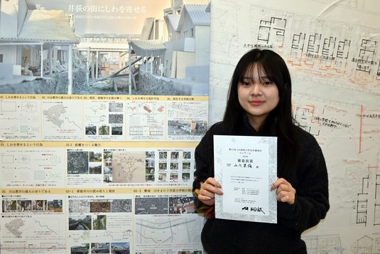 建築都市学部建築学科4年次生の山内菜摘さん(指導教員=野口直人講師)が、2月23日に横浜市役所で開催された「神奈川県7大学1専門学校 卒業設計コンクール」で審査員賞「玉田誠賞」を受賞しました。JIA 関東甲信越支部神奈川地域会が主催する「JIA神奈川建築WEEK『かながわ建築祭2026』」のプログラムとして実施されたもので、実社会で活躍する建築家と学生のふれあいの場をつくることなどを目的に毎年開かれています。