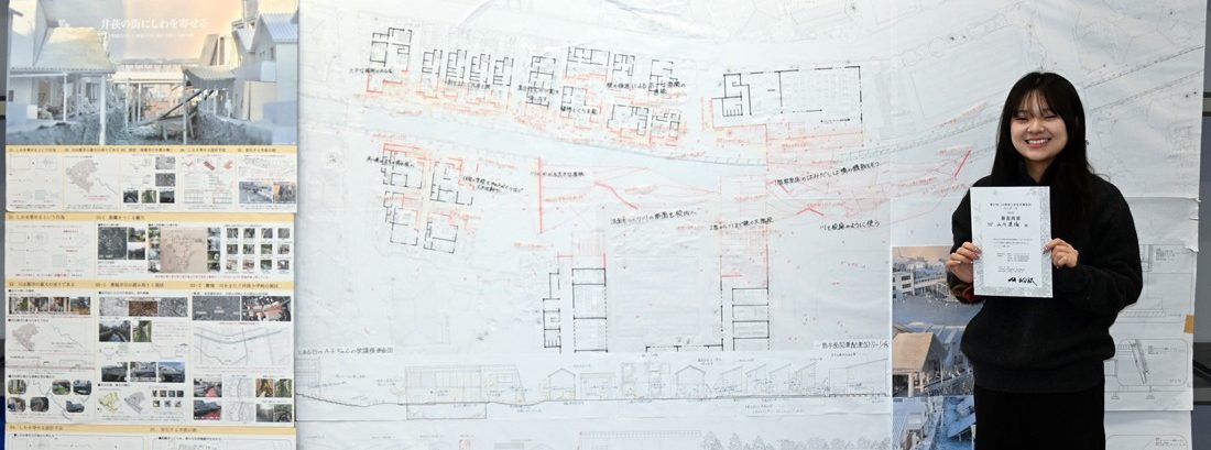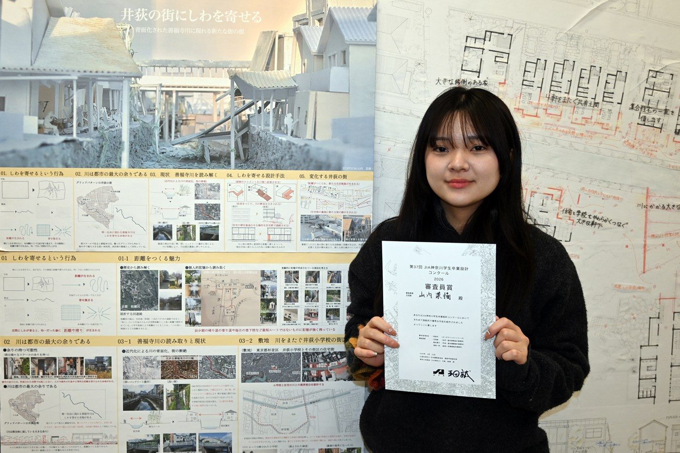 建築都市学部建築学科4年次生の山内菜摘さん(指導教員=野口直人講師)が、2月23日に横浜市役所で開催された「神奈川県7大学1専門学校 卒業設計コンクール」で審査員賞「玉田誠賞」を受賞しました。JIA 関東甲信越支部神奈川地域会が主催する「JIA神奈川建築WEEK『かながわ建築祭2026』」のプログラムとして実施されたもので、実社会で活躍する建築家と学生のふれあいの場をつくることなどを目的に毎年開かれています。