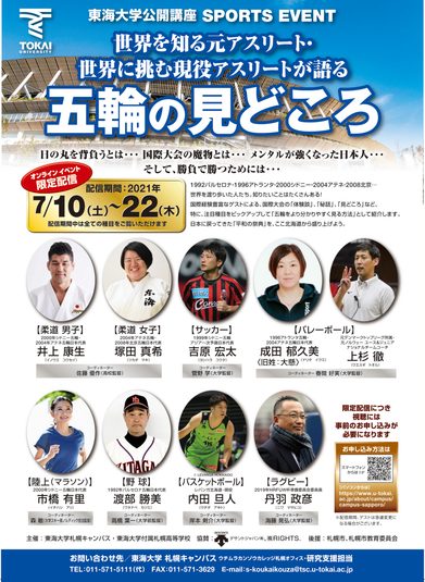 札幌キャンパスでは7月10日(土)から22日(木)まで、東海大学公開講座SPORTS EVENT「世界を知る元アスリート・世界に挑む現役アスリートが語る五輪の見どころ」をオンラインで配信します。本学卒業生や北海道にゆかりのある競技経験者(現役選手を含む)の中から、五輪をはじめとする国際大会などの大舞台を経験してきた方々をゲストに迎え、大会での体験談や秘話、見どころなどを紹介。また、7月23日(金)に開幕する東京五輪の注目種目をピックアップし、「五輪をより分かりやすく見る方法」を解説していただきます。視聴には事前のお申込みが必要となります。ぜひご覧ください。
