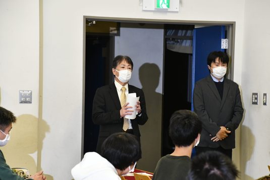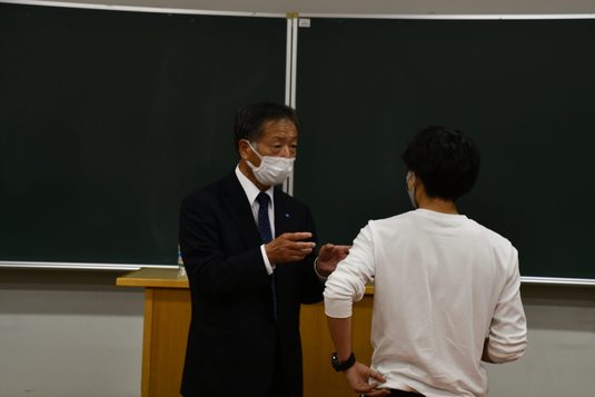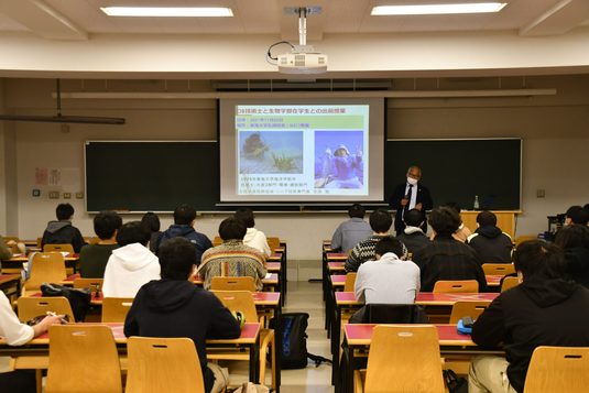「生物学部の皆さんが対象となる技術士補試験では、生物・生態系の知識を生かし、生物工学・環境・水産部門が適切です。4年間の学びの集大成として挑戦してください。どの部門の受験でも大学で学ぶ知識と幅広い専門分野の勉強が必要で、贈呈した基礎・適性に関する図書の参考が合格の近道であり、就職先で胸を張って誇れる資格を目指してください。私の長い人生を振り返れば、やりがいのある仕事につき、楽しんで仕事に向き合えば自分の力が十分発揮できます。在学中に取得した技術士補の資格を生かして、就職活動で海洋生物学科を生かせる就職先をぜひ選んでください」と熱く語りかけました。