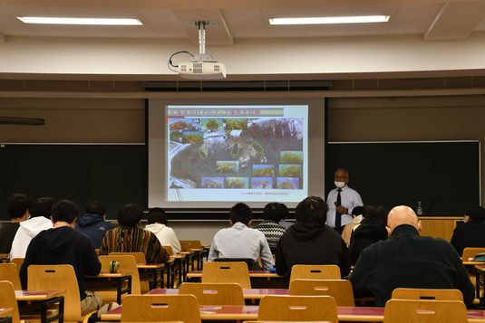第2部では、自らが専門とする日本沿岸の藻場の種類と役割・生態系、北海道で近年問題化しているコンブが減少し漁業生産が低下する磯焼けの要因を詳細に解説されました。さらに、磯焼けした北海道各地の沿岸域における鉄イオンを活用したコンブ場の再生事業の施工方法と、その成果をドロ-ンによる航空写真で解かりやすく紹介されました。また、終わりに久一さんが「技術士の資格は自信をもって実社会で活躍でき、70歳を過ぎても第一線では働けますので、なにか質問があればぜひ連絡をください」と呼びかけ、本学科の櫻井泉教授が今年度の資格試験の概要を説明しました。