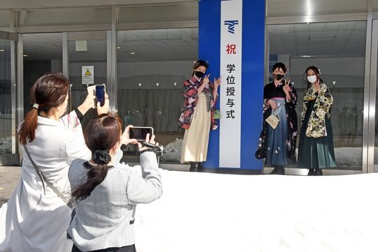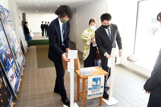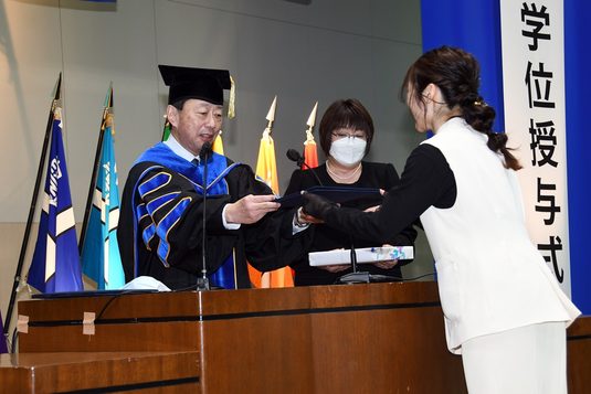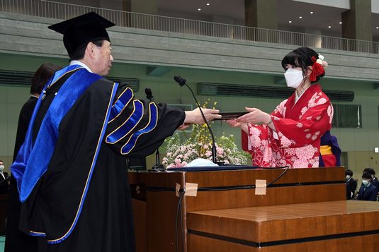 札幌キャンパスでは3月21日に第一体育館で、2021年度秋学期学位授与式を挙行しました。今年度は大学院生物学研究科生物学専攻1名、国際文化学部226名、生物学部119名に学位記を授与。会場では手指の消毒や検温、座席間隔の確保など、新型コロナウイルス感染症対策を講じ、ライブ配信も実施しました。
