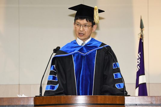 最後に閉式の辞を述べた網野真一札幌キャンパス長は、新聞の読者の声欄に掲載された大学4年生の、「コロナ禍でサークル活動もアルバイトも留学もあきらめたけれど、春からまた頑張りたい」という言葉を紹介し、「コロナ禍だからこそ経験できたこと、身に着いたことに目を向ける考え方もありますが、やはり喪失感が大きいと思います。皆さんは入学して半年後に北海道胆振東部地震で停電や断水といった不自由な生活を体験しました。今、外に目を向ければ戦争が勃発して多くの人が犠牲になっています。人生には個人の力がおよばない、予想外なことが起こり得ます。そんなとき、一時的に打ちのめされることがあっても、最後は自分を信じ、前を向いて進むしかありません。賢く、力強く、しなやかに進んでください」とエールを送りました。