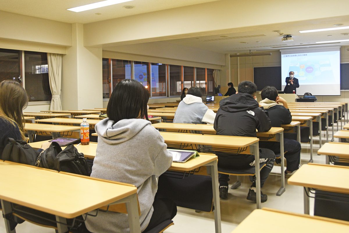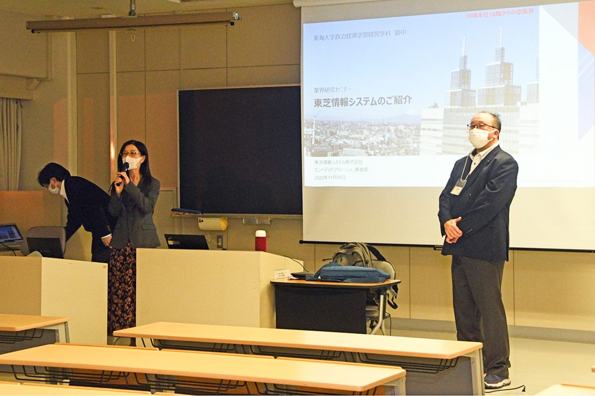経営学部経営学科(政治経済学部経営学科※)では11月9日に湘南校舎とオンラインで、東芝情報システム株式会社による業界研究セミナーを開催しました。就職活動本番を控える3年次生にIT業界について知ってもらうとともに、事前準備として重要な企業研究や業界研究につなげてもらおうと企画したものです。当日は、東芝情報システムの結城健晴氏(工学部原子力工学科1989年度卒)が湘南校舎で、森健氏(政治経済学部経営学科2002年度卒)と上野祐輔氏がオンラインで講師を務め、対面とオンライン合わせて約90名が参加しました。