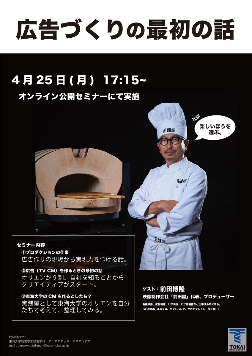 経営学部経営学科と政治経済学部経営学科では4月25日(月)にオンラインで、公開セミナー「広告づくりの最初の話」を開催します。講師を務める前田博隆氏は、映像制作会社「前田屋」代表取締役兼プロデューサーとして「ソフトバンク」や「ユニクロ」「sacai」「群言堂」「サカナクション」「女王蜂」などのテレビCMやウェブ動画、ミュージックビデオといった映像を中心にグラフィックやブランディングなどを手がけています。一方で、ピザ屋の側面も持ち、前田屋葉山本店(本社)では薪窯、目黒駅前店(分室)ではガス窯で焼いたり、イベントやケータリングなどピザ活動もライフワークにしています。講演では、「楽しいほうを選ぶ。」を社訓に取り組んできた広告づくりの現場やプロダクションの仕事、広告制作について語るほか、「東海大学のCMをつくるとしたら?」と題したワークショップも実施する予定です。キャンパス、学部学科問わず参加可能で、事前のお申し込みが必要です。お誘いあわせのうえ、ぜひご参加ください。