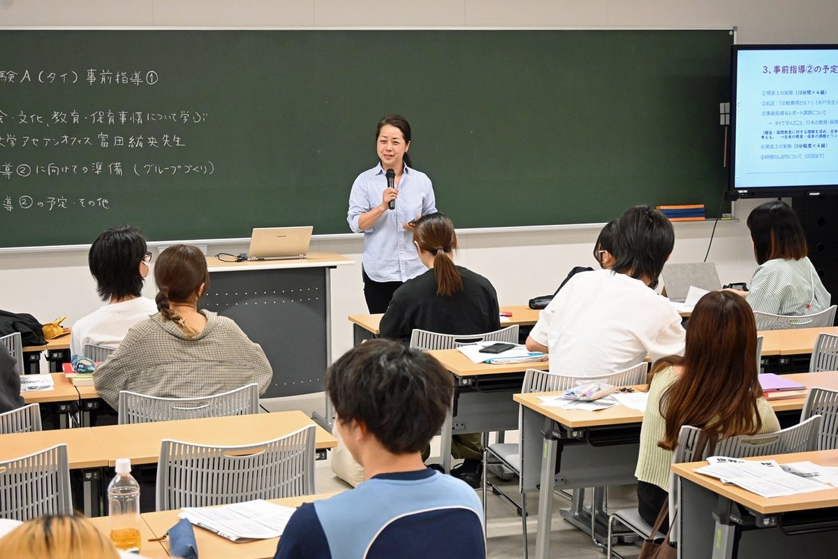 児童教育学部児童教育学科では5月22日に湘南キャンパスで、本学科が開講するサマーセッション「海外教育体験A」の事前指導を実施しました。今年度初めて開講するこの科目は、タイの幼稚園、小学校への訪問を通して他国の保育・教育を学び、学生にグローバルな視点で自らの考えをもってもらうことを目的としています。今回の事前講義には、8月24日から9月1日までタイの首都・バンコクや南部の県・チュンポーンを訪問する3年次生16名が出席しました。