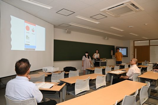 活動報告会には、秦野市から岩渕氏と同市の子ども健康部、文化スポーツ部の職員も出席。最初に、小学校の学童をテーマにしたグループ「放課後ヒーローズ」が登壇し、5、6月に秦野市立鶴巻小学校第2児童ホームで放課後児童支援員の活動に参加した経験を踏まえて若い世代の支援員が少ないことを課題に挙げ、本学や近隣の大学で学ぶ学生がボランティアに参加する制度設計の必要性を訴えました。続いて、市内回遊型のデジタルスタンプラリーを企画・実施したグループ「いぶんかチーム」が、7月に小田急線・秦野駅と秦野市立図書館、はだの歴史博物館の3カ所で実施したイベントについて報告。小学生以下を対象としたことから子どもでも読みやすいポスターの作成や景品の用意といった工夫、参加者増加に向けた課題などを説明しました。最後に、神奈川県が子育て世帯の外出を応援するため協力施設の優待サービスをまとめているサイト「かながわ子育て応援パスポート」を調査したグループ「crsp(child-rearing support project)」が発表しました。本学科が湘南キャンパス20号館で実施している「あかちゃんひろば『きらり・Tokai』」の利用者向けに近隣の協力施設マップを掲示したほか、協力施設の店舗でインタビューした内容を紹介。自治体ごとに協力施設の数や更新頻度が異なる点を課題に挙げました。発表後は教員や市職員から質疑応答や講評があり、今回の活動から抽出された課題の具体的な解決に向け、活発に議論しました。