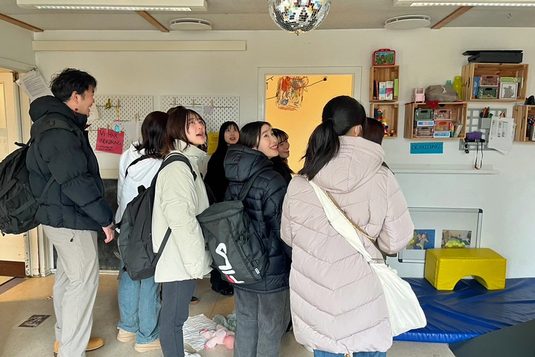 12月と1月には湘南キャンパスで事前指導を実施。学生たちは4つのグループに分かれて、訪問先の学校で子どもたちと日本の伝統的な遊びで交流する企画内容を考案。日本の教育・保育システムにおける課題についてもディスカッションしました。さらに、オンラインで同センターのヤコブ・スキュット・イエンセン事務長が講義し、デンマークの文化や社会、教育についての理解も深めました。現地では、保育園や幼稚園、生まれつき高い知能や才能をもつ「ギフテッド」の子どもたちが通う小学校など、さまざまな施設を訪問。校長や教員から学校の理念や運営方法などの説明を受け、授業を見学しました。また、アブサロン大学やグルントヴィ・フォルケホイスコーレの学生とも交流。アブサロン大学では実際に行われている「英語教育」に関する講義に参加し、デンマークの教員養成制度についても学びました。
