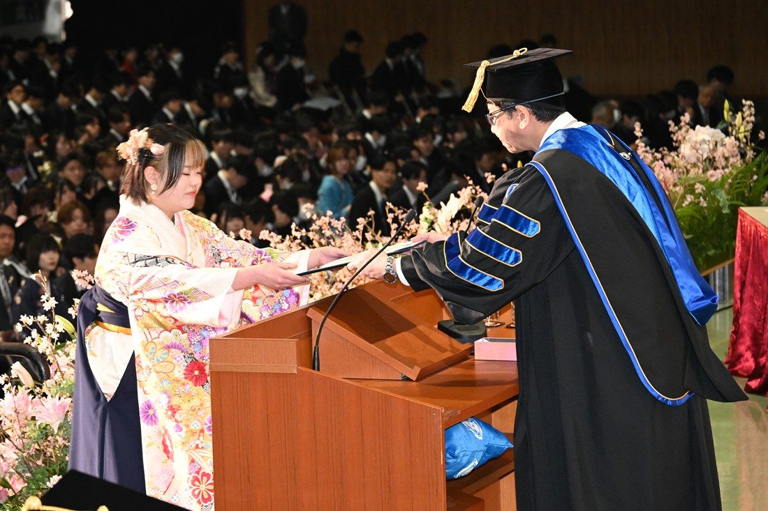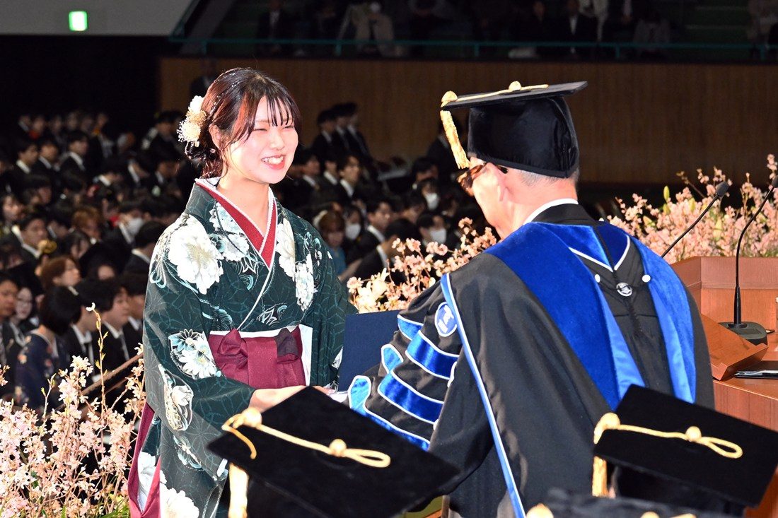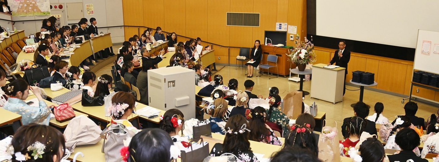 山本学部長は、「1期生なので、足りないことや“もっとこうしてほしかった”と思うこともあったかと思いますが、前例がない中で先生方が一生懸命支えてくれたおかげで、無事学生を送り出すことができました。保育士資格、幼稚園教諭免許、小学校教諭免許の取得率は合わせると約90%、小学校採用試験は合格率92%とそれぞれ高い数字を残し、春からは100名を超える卒業生が小学校や幼稚園、こども園、保育園、福祉施設など、さまざまな場所で専門職として活躍してくれます。一般企業への就職や大学院進学といった道に進む学生もいますが、子どもに関連する仕事や研究に携わるケースが多いので、4年間で学んだことを大いに生かしてもらいたいと思います」と話します。また、「本学部では“子どもまるごと理解”をテーマに、保育・教育の現場だけでなく、児童養護施設など福祉の現場でも実習を行い、子どもが置かれている環境を保育・教育と家庭の両面から理解しようと学びの環境を提供してきました。各自治体の教育委員会からはお褒めの言葉をいただくことも多く、各現場での経験を得て成長した学生たちを誇りに思います。この4年間の成果と課題を踏まえ、次年度以降も質の高い教育を展開していきたい」と語りました。