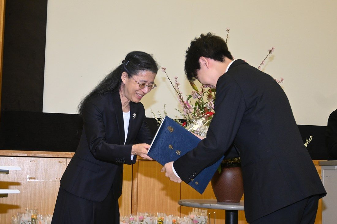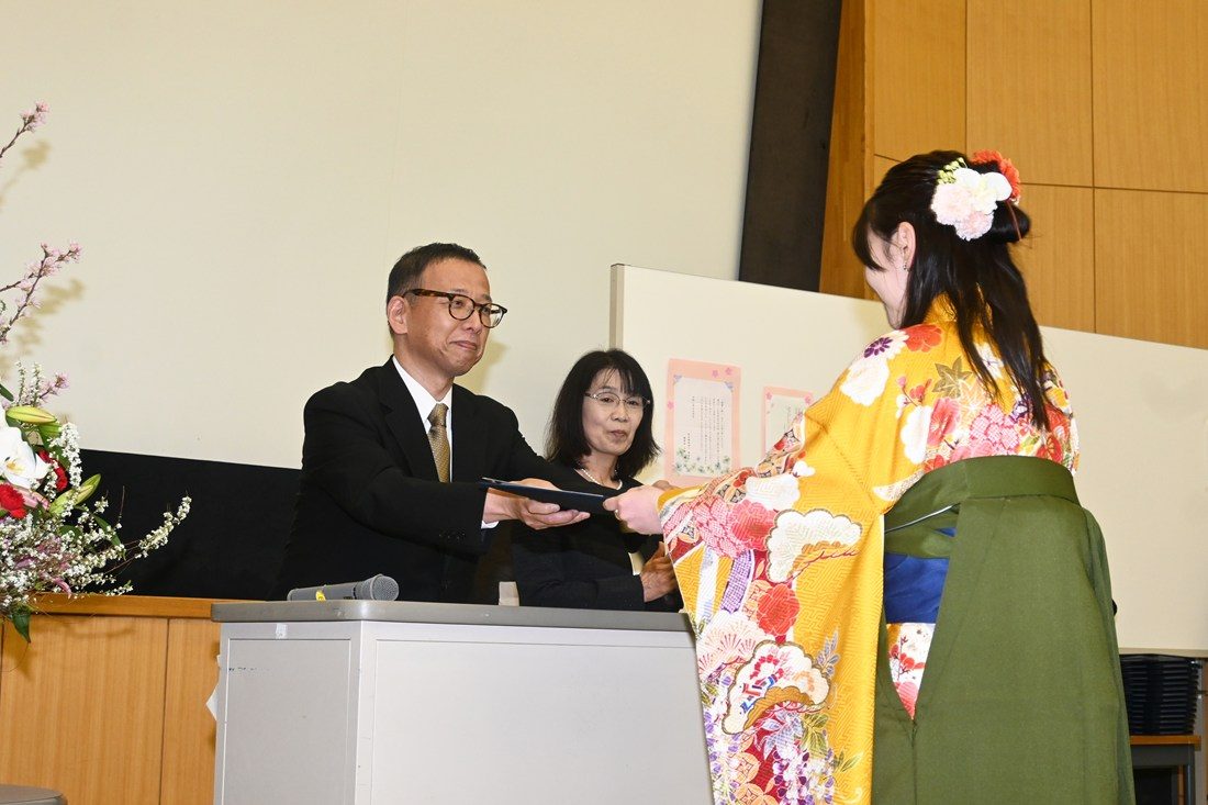 山本学部長は祝辞として、卒業生と保護者に向けた感謝の思いを述べ、「大学での4年間は、うまくいったことも、そうでないこともあったと思います。これからの人生においても、うれしいことや迷いが生じることがあるでしょう。それらを理解し、親身に支えてくれるのは大学時代の友人です。一生の宝としてこのご縁を大事にしてください。また、卒業後も何か困ったことがあれば、いつでも大学に会いに来てください。私たち教員は、いつまでも皆さんを応援しています」と語りかけました。その後は、学業成績、人物ともに優秀な学生に贈られる足利惇氏賞を受賞した川久保愛美花さんに賞状と記念品を授与。各教員からはなむけの言葉が贈られました。学生からは、「幼稚園、保育園、小学校など、4年間さまざまな現場で実習に取り組みました。毎回最初は不安でしたが、子どもたちと接する中でやりがいを感じるようになりました。忙しくも充実した4年間でした」「どの授業でも、子どもに寄り添う大切さを先生方から教わりました。卒業後は小学校の教員になるので、実践を通して学んだことを仕事に生かし、多角的な視点を持って子どもたちと接したい」といった声が聞かれました。