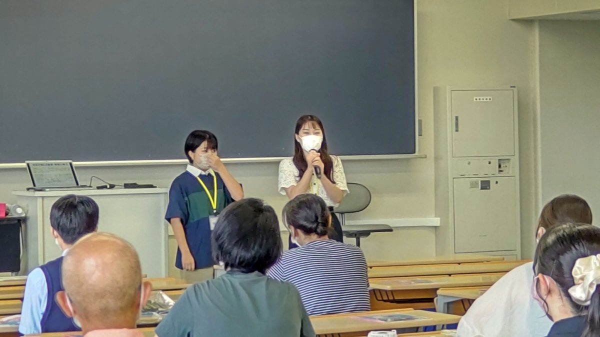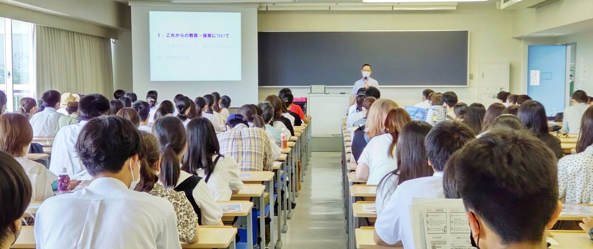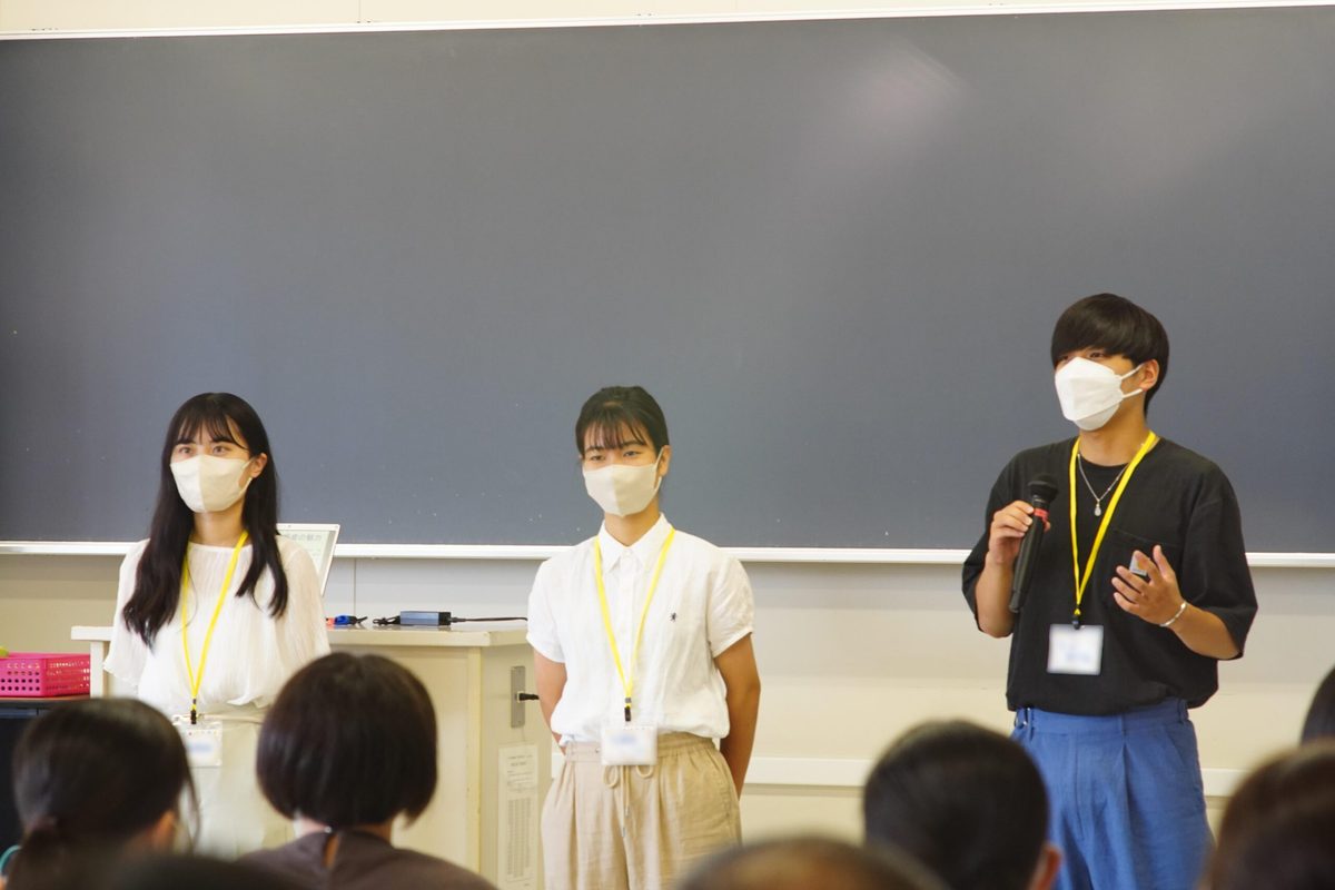 学生は「保育士・幼稚園の先生・小学校の先生の3つの資格を取れるので、将来の選択肢を広げられるところが魅力と感じています」や、「あかちゃん広場を通じて地域の子育て支援ができることがとても嬉しく感じる」、「特化プログラムである国際理解教育に参加して、より視野を広げたい」など、一人一人しっかりとした回答を述べていました。