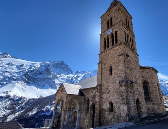 この時期は積雪もあって、レンタカーなどではなかなかアクセスするのが難しいのですが、今回行った標高1500メートルの村ラ・グラーヴには12世紀の美しいロマネスク様式の聖堂がありました。またさらにその上にあるレ・テラス集落(標高約1800メートル)にも味わい深いサン=マテュー教会があります(写真)。実はこの聖堂は19世紀に建てられたもので、それほど古いものではありません。しかしその鐘塔や、この地方によく見られる玄関ポーチなど、中世ロマネスク建築の雰囲気をしっかりと保って建てられており、そうした古い雰囲気と周囲の高い山々が美しく調和しています。歴史と伝統を大切にするフランスのやり方は、私たちにとっても大いに参考になるものだと言えるでしょう。