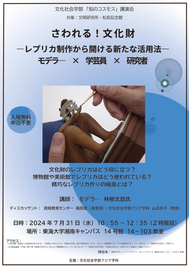 博物館や美術館に展示されている本物の作品はさわることができない。しかし、さわってみないとわからないことも多い。本学では松前記念館を中心に行われている平塚盲学校とのワークショップや、AENET(東海大学古代エジプト及び中近東コレクション)のクラウドファンディングによる古代エジプト神像の保存修復復元プロジェクトなど、レプリカを積極的に文化財活用に応用している。