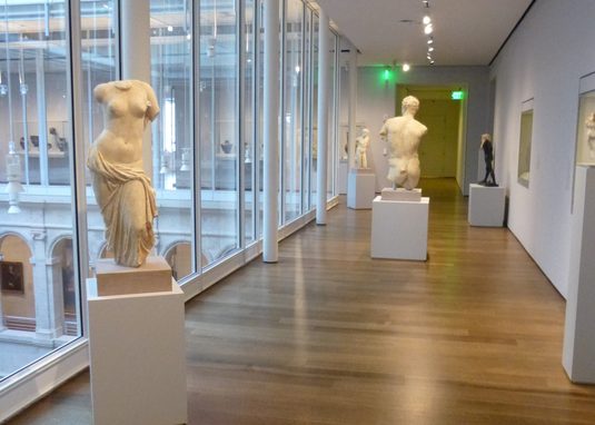 大学美術館は10年ほど前に改築され、コレクションの展示場所も変わりました。2014年に再訪したとき、これらのギリシャ彫刻は、美術館の回廊に展示されていました(写真C)。この展示もなかなか面白いと思います。