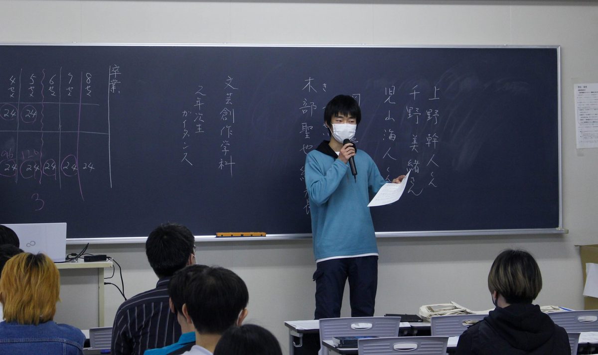 昨年1年間、コロナ禍によってキャンパスに出入りする機会を奪われた新2年次生にとって、新学期ガイダンスが初めての顔合わせ。巣籠もりで鬱積した気分を吹き払って、元気な顔がそろいました。岡本夢生さんが新2年次生代表でスピーチ、また、先輩代表として文藝工房編集長・木部聖也さん(3年次生)がエールを送りました。