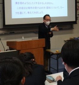 内容は、自己表現の仕方(受身的、攻撃的、協調的)や言葉以外の表現(表情や対人的距離など)、マスクをして会話をするときに気を付けたいこと(マスクをしていると笑顔は伝わりにくいので、目元や声のトーンを強調して伝えるようにするなど)などを解説しました。また、物事に対して一人ひとり独自の受け止め方を持っていることを確かめるワークを行いました。私からは「同じことを見聞きしたとき、自分と相手が違う感じ方や受け止め方をすることはよくあります。相手との違いは、マイナスの感情や考えを生むこともありますが、違うからこそ楽しかったり、新しい発見があったりすると思います。友達と考えや感じ方が違うことは当たり前と考えて、その違いを受け入れて、面白いと思えることが大切であると思います。」という話をしました。