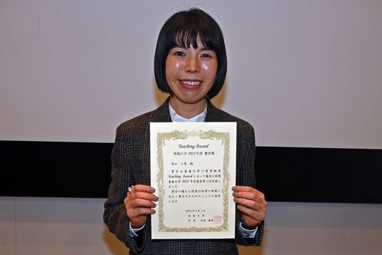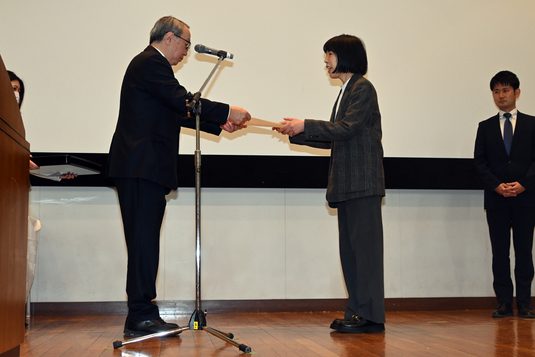 文化社会学部文芸創作学科の青山七恵講師が「2022年度ティーチング・アワード」の優秀賞に選ばれ、4月1日に湘南キャンパスで行われた授賞式で松前義昭学長から賞状と目録が授与されました。本学では教育の質向上を目指し、2002年度から優れた授業を行う教員らを「ティーチング・アワード」として顕彰しています。学生による授業アンケートなどの結果に基づき、ユニバーシティビューロー(学長室)を中心とした厳正な審査を経て学長により決定されるもので、2022年度は5名に優秀賞を授与しました。