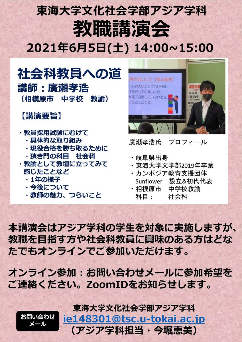 東海大学文学部アジア文明学科卒業後、相模原市で中学教諭(社会科)として勤務する廣瀬孝浩さんを2021年6月5日(土)にお招きしております。廣瀬さんは学部4年生で難関される中学社会科(神奈川県・相模原市)の教員採用試験に合格し、2020年4月から教壇に立ってきました。コロナ禍で学校教育に従来とは異なる対応が迫られるなか、新任教員としてどのように生徒たちに向き合ってきたのでしょうか。