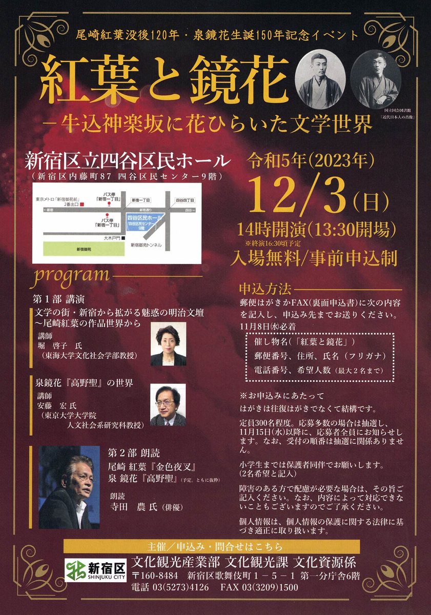 なお、イベント当日は堀啓子先生と東京大学大学院教授・安藤宏先生の講演のあと、俳優の寺田農氏による紅葉と鏡花のテクストの朗読会がつづきます。