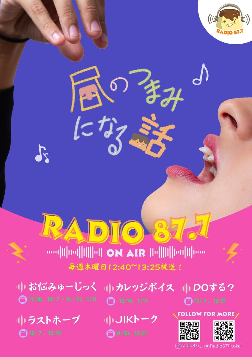 番組内容は、「昼のつまみになる話」をテーマに、お悩み相談あり、留学生のトークあり、ラジオドラマありのバラエティで、お昼休みの時間にたっぷりとオリジナル番組をお届けします。