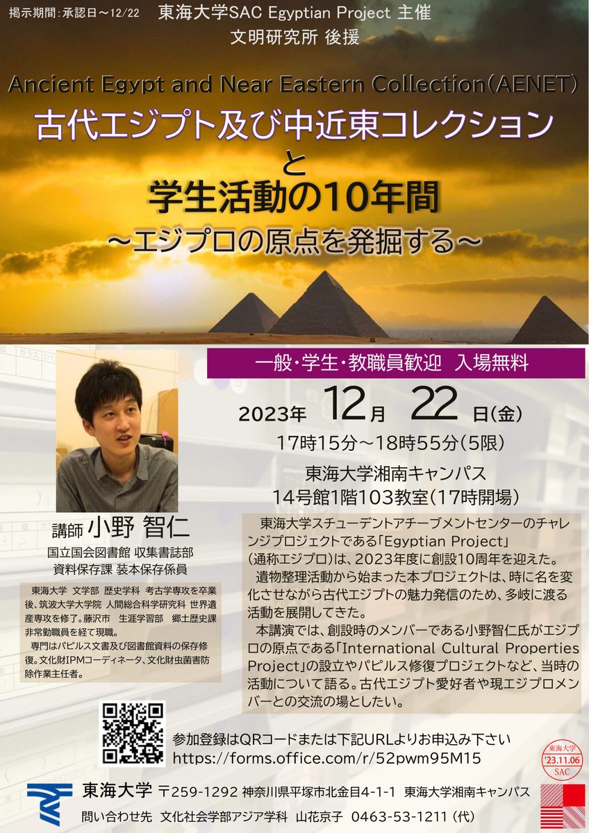 東海大学Egyptian Projectでは、12月22日(金)に【古代エジプト及び中近東コレクションと学生活動の10年間~エジプロの原点を発掘する~】と題し、国立国会図書館 収集書誌部 資料保存課 小野智仁氏を講師に迎え、講演会を開催します。