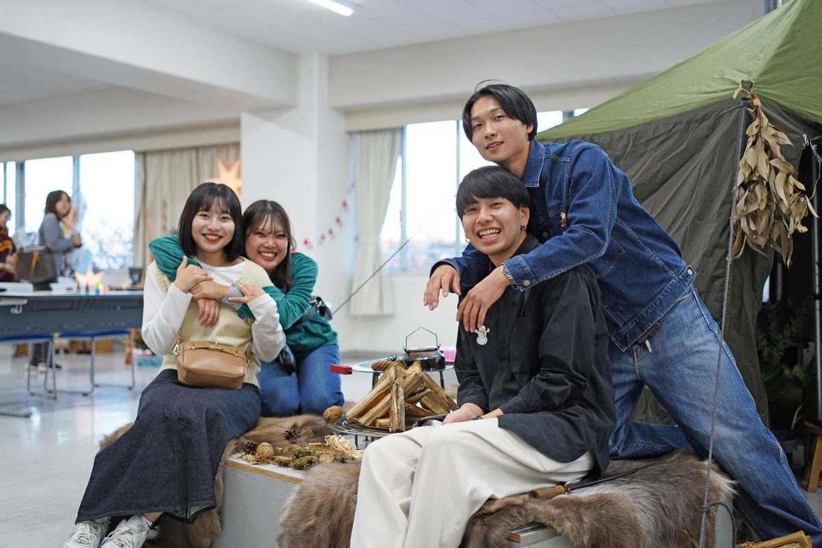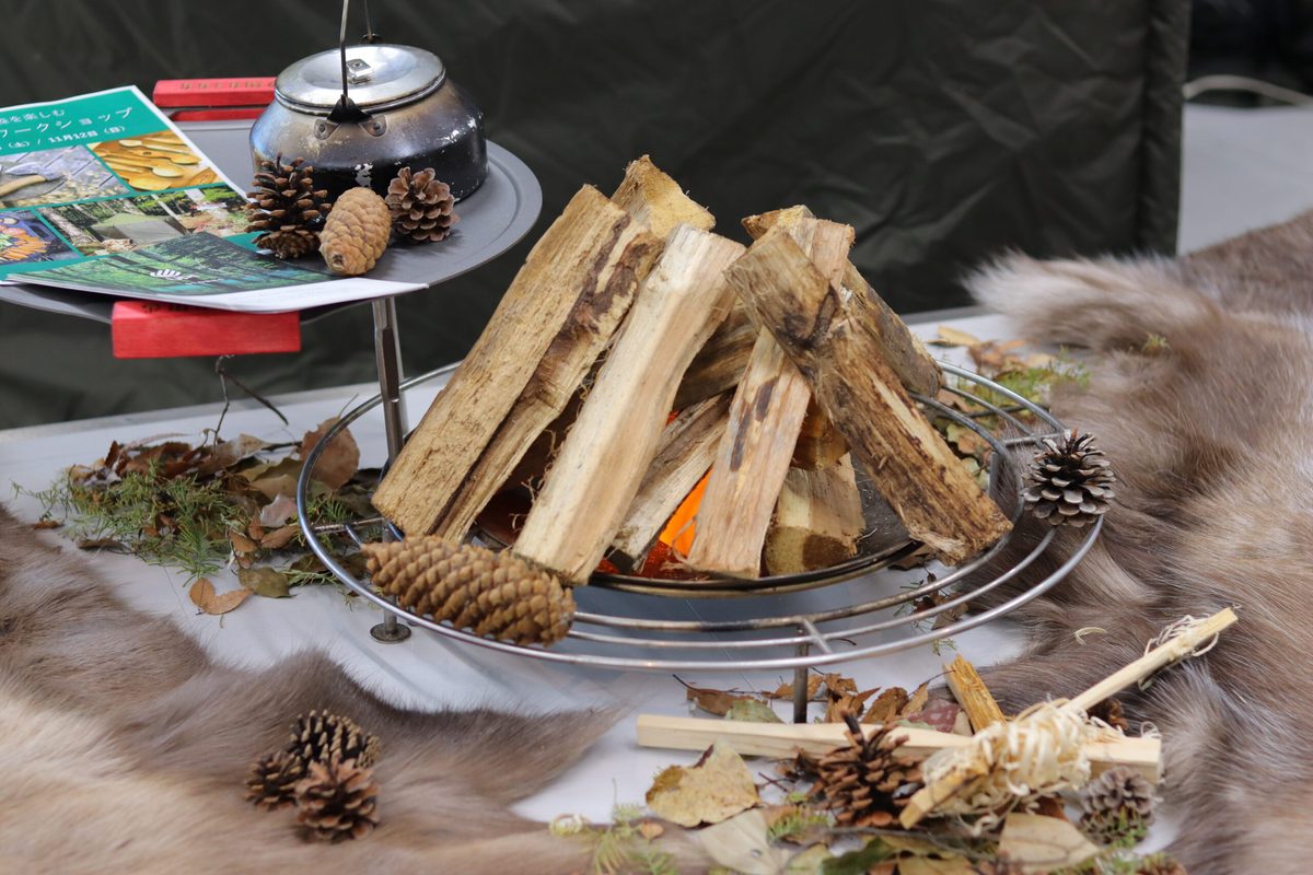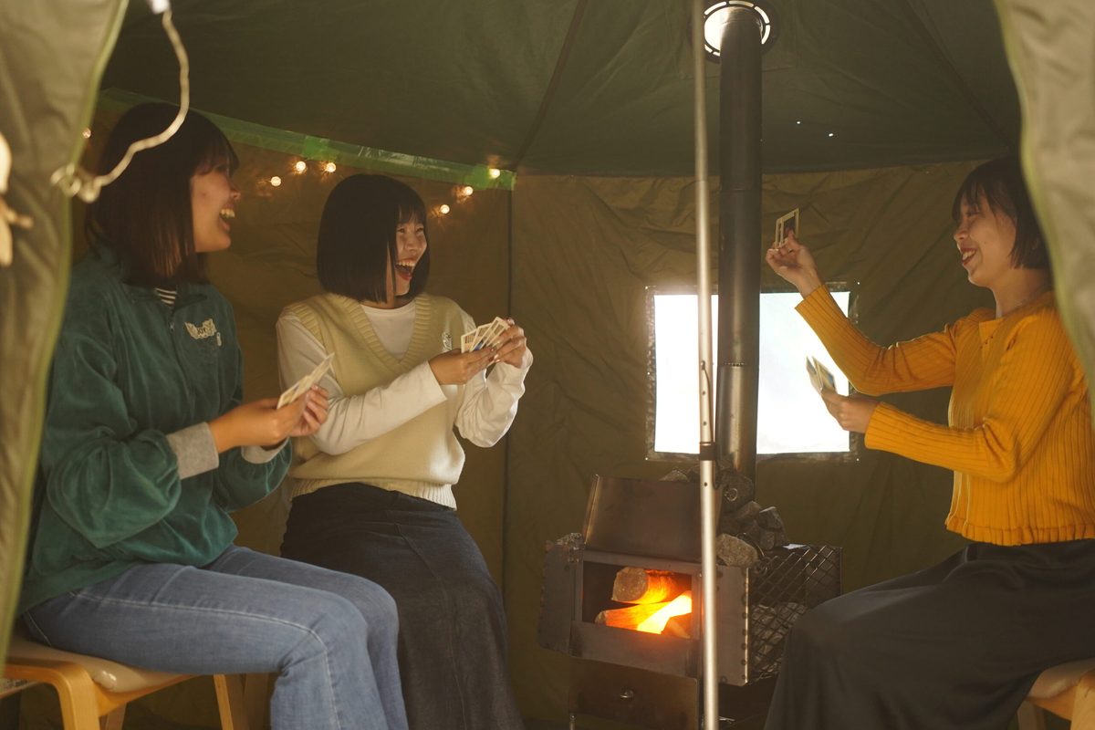 学生たちが焚火台とテントサウナに本物の薪と揺らめく炎を再現したランプを設置しており、まるで本物の焚火のような暖かな雰囲気を醸し出していました。