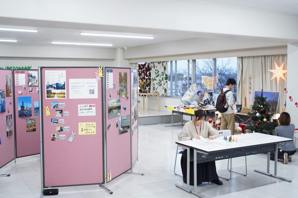 3・4年次生のゼミ活動を紹介するコーナー、フィンランドを代表する家具ブランドArtekの椅子やテーブル展示の他、フィンランドのヒンメリやデンマークのユールヤータなどクリスマスのクラフトを創作するワークショップのコーナーでは、地域の方々が参加される場面も。お子様にも楽しんで頂けました。