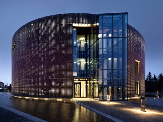 次に国の機関であるアルニ・マグヌソン言語文化研究所の役割や、さまざまなプロジェクト、新設の建物についても紹介がありました。最近新しく建てられたという研究所の外壁には二つの文章が刻まれています。