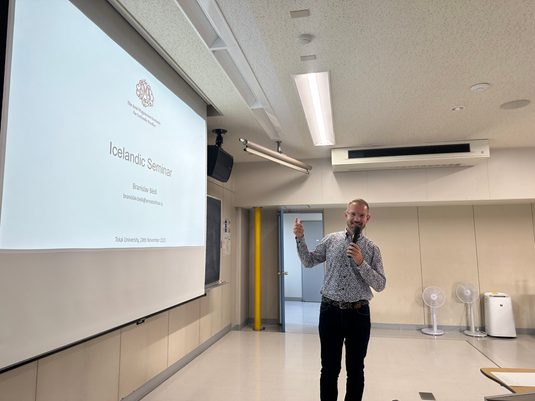 11月24日(金)に文化社会学部北欧学科の授業「アイスランド概論」(担当教員:柴山由理子)で、同国のアルニ・マグヌソン言語文化研究所研究員ブラディスラヴ・ベニ博士がアイスランドの言語・文化の保存、研究、学習の促進に関する仕組みや取り組みについて紹介してくださいました。