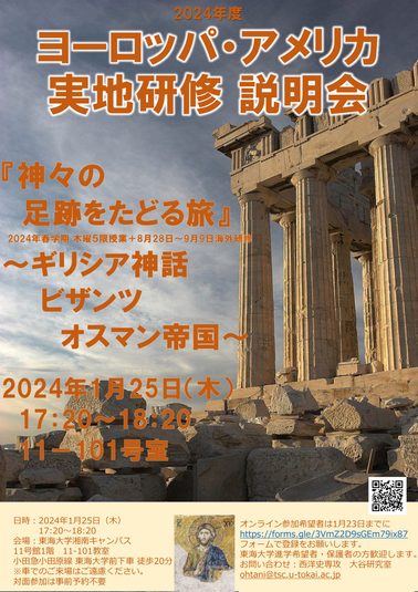 2024年度授業では、「神々の足跡をたどる旅~ギリシア神話・ビザンツ・オスマン帝国~」と題し、春学期の木曜5限に湘南キャンパスで実施される講義と併せ、8月下旬~9月上旬に約13日間の予定で、アテネ(ギリシャ)、イスタンブール(トルコ)を訪問先とした海外研修を行います。