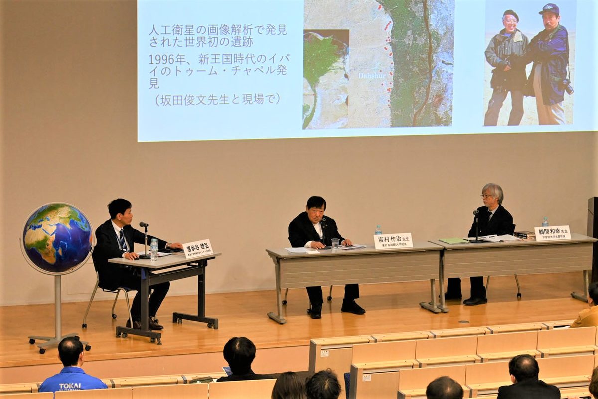 セッション4「パネルディスカッション―古代エジプト×古代中国~共通性を探る」では惠多谷研究員が司会を務め、吉村作治氏と鶴間和幸氏が登壇。吉村氏は半世紀以上にわたり現地発掘調査を継続してきた研究者人生を振り返り、本学の故・坂田俊文名誉教授(元TRIC所長)との共同研究で多大な業績を上げた宇宙考古学の黎明期について語りました。鶴間氏は、中国文明とエジプト文明の共通性について自身の調査・研究を絡めながら知見を披露。リモートセンシング技術の発達によって世界の古代文明や古環境の復元や、文明の比較検討ができるようになるなど宇宙考古学の可能性について語りました。