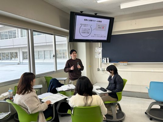 午前の特別講義では、アジア学科の立石謙次先生が「東アジアの伝統芸能とその継承」というテーマで講義を行いました。東アジアにおける伝統芸能の現状とその継承に向けた各地での工夫について熱く語ってくれました。(立石先生の研究分野の詳細はコチラから)学生からは、「普段は自国の伝統芸能にあまり関心がなく、むしろ海外の伝統芸能には興味と知識があったが、今回をきっかけに自国の伝統芸能の継承について再考する時間となった。」「昔からの伝統をただ継承するのではなく、特別講義を通して次世代につなげるために、今自分たちができることを真剣に考えることができた。様々な手段で記録を残すことや、そのために自らが興味を持ち、情報を積極的に共有・発信することが重要だと学ぶことができた。」といった感想が寄せられました。