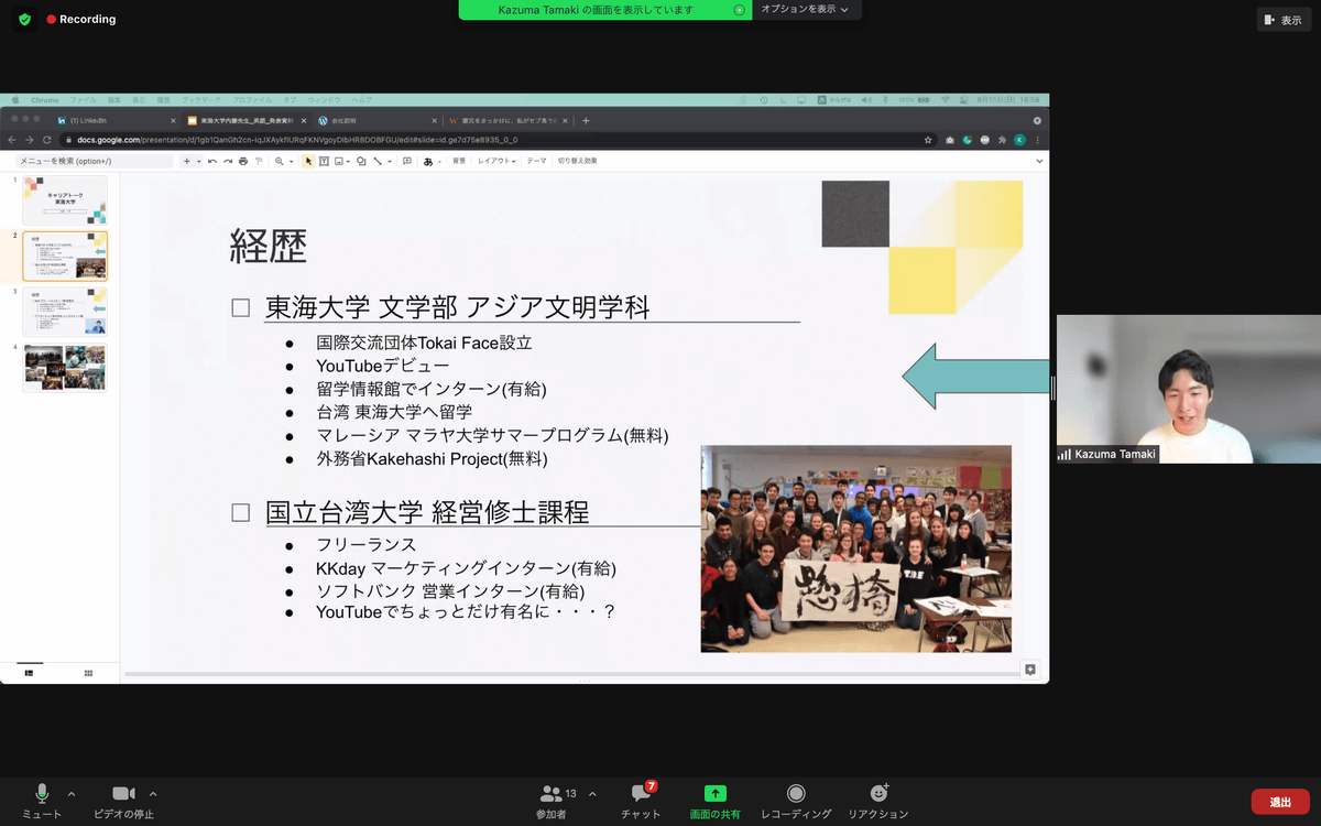毎年、アジア学科ではフィリピン・セブ島英語留学を推奨してきました。コロナ禍の今夏、オンラインでの実施にもかかわらず31名もの学生が英語の学習に取り組んでいます。そのオンライン留学生に向けて8月15日、特別講演が行われました。講師は、17年卒の玉置一真さん。東海大卒業後、国立台湾大学ビジネススクールを修了、大手航空会社勤務を経て現在はグローバル展開をする総合コンサルティング会社日本法人に勤めておられます。英語でのやり取りが欠かせない毎日を過ごしている玉置さんに英語学習の秘訣を伝授していただきました。中国語も堪能な玉置さんからは「英語プラスもう1言語」のお勧めも。