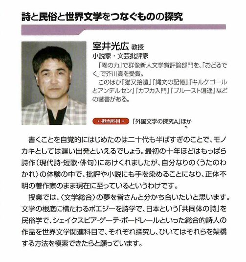 2011年度まで文芸創作学科で教壇に立たれた室井先生は、1955年福島県会津の生まれ、ボルヘス論で群像新人賞を受賞し、小説「おどるでく」で芥川賞を受賞し、詩・批評・小説を横断する諸作品を残した、稀代の文学者でした。が、惜しくも2019年、64歳で急逝されました。室井先生は何を達成しようとしたのか、わたしたちが受け継ぐものは何か、考えるきっかけになるような会にしたいと思います。
