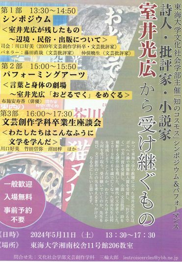 5月11日(土)13:30~17:30、湘南校舎11号館206教室において、「知のコスモス」〈室井光広から受け継ぐもの〉を開催します。