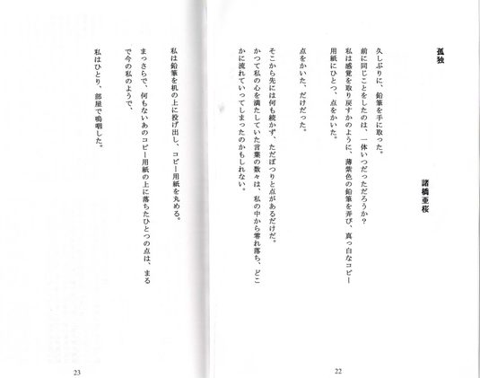 「孤独」は、作品を書こうとしても書くことのできない煩悶をテーマにした作品ですが、それは二次元的な文字を形成する以前、一次元の「点」に留まるものでしかない。出口のない閉塞感を書き込みながら、自己を客観視する視点がきちんと担保されており、文体には強度がもたらされています。