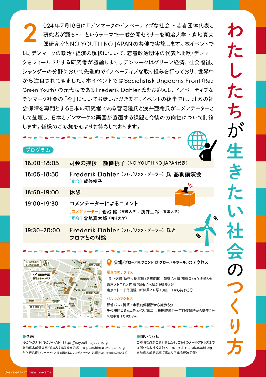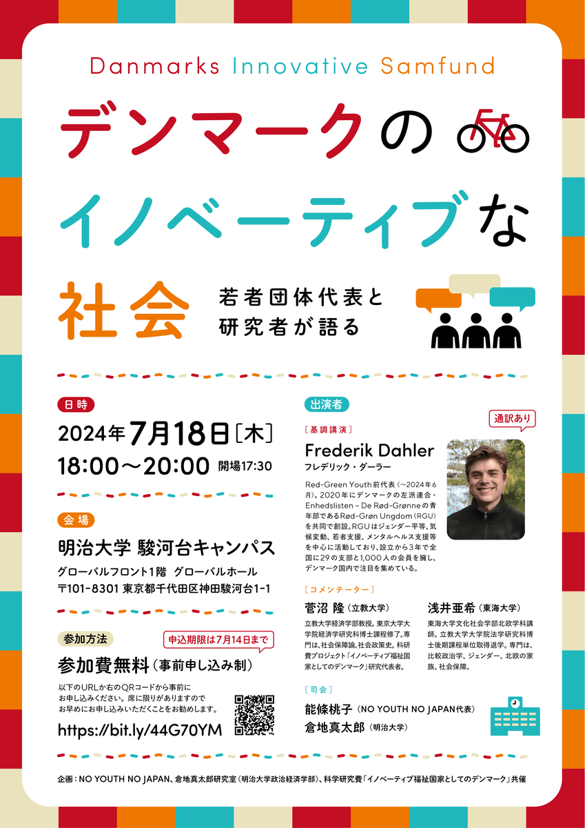 明治大学・倉地真太郎研究室とNO YOUTH NO JAPANが共催する公開セミナー「デンマークのイノベーティブな社会~若者団体代表と研究者が語る~」では、Socialistisk Ungdoms Front(Red Green Youth)の元代表であるFrederik Dahler(フレデリック・ダーラー)氏をお迎えし、イノベーティブなデンマーク社会の「今」についてお話ししていただきます。セミナー後半には、北欧の社会保障を専門とする日本の研究者である菅沼隆先生(立教大学経済学部教授)と浅井亜希先生(東海大学文化社会学部北欧学科講師)がコメンテーターとして登壇し、日本とデンマークの両国が直面する課題と今後の方向性について討論します。