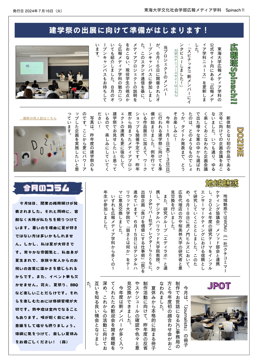 『スタジオ通信』は、広報メディア学科のメディアプロジェクトの活動を紹介するwebサイト「東海メディアINFO」の「PR(Spinach!!コーナー)」からご覧いただけます。