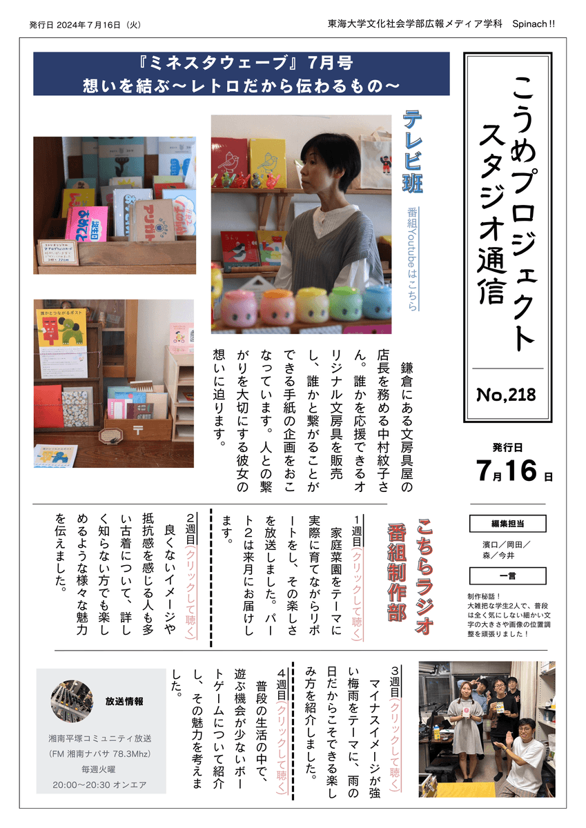 スピナッチ‼では、「テレビ班」「ラジオ班」「DOZIN」「地域魅惑」「JPOT」「スピナッチ!!」の計6つのメディアプロジェクト※の活動内容をまとめたウェブ広報誌『こうめプロジェクトスタジオ通信』(以下『スタジオ通信』)を毎月、制作・公開しています。