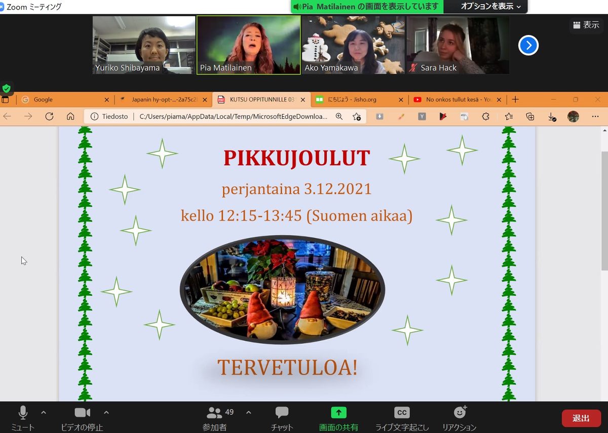 冒頭フィンランドのクリスマスの音楽を流した後に、マティライネン先生と山川先生から挨拶の言葉があり、その後Zoomのブレイクアウト機能を使い、1グループ3~4人で15分ずつ、メンバーを数回変えながら交流を楽しみました。フィンランドに住む学生が庭に積もる雪の景色を見せてくれるなど、冬のフィンランドを生で感じられる場面もありました。また、なぜ日本語やフィンランド語を学んでいるのかという質問で盛り上がりました。日本語を学んでいる学生の中には、村上春樹の作品が好きという方や、配偶者が日本人である、中学生の頃から何となく日本語に興味を持っていたという方などがいました。フィンランド語を学んでいる方々からは、北欧雑貨に興味がある、言語学に興味がありユニークな言語としてフィンランド語に関心を持っているなどという声が聞かれました。