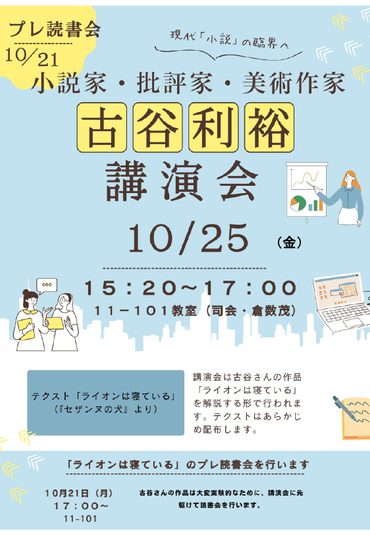 古谷利裕講演会 10月25日(金)4限(15:20-17:00)、11号館1階101教室(11-101教室)