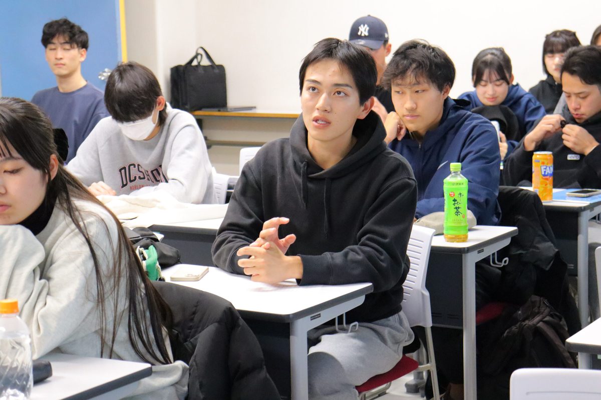 本科目では、就活を控えた3年生も多く受講していることから、マーケティング理論の一つであるSTP分析に沿った思考を体験して、それを就活に結びつける方法を考えました。どんな発想にもポジティブな評価を与えてくれる玉置さんに、学生たちは自信をもらったようです。