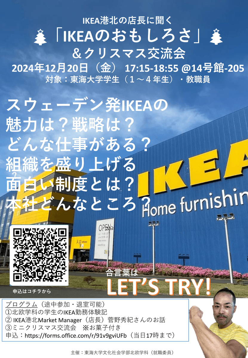 北欧学科では、IKEA港北Market manager(店長)の菅野秀紀さんをお呼びし、イケア独自の制度や、イケアの故郷エルムフルト(スウェーデン)訪問の話などを伺う交流会を開催します。